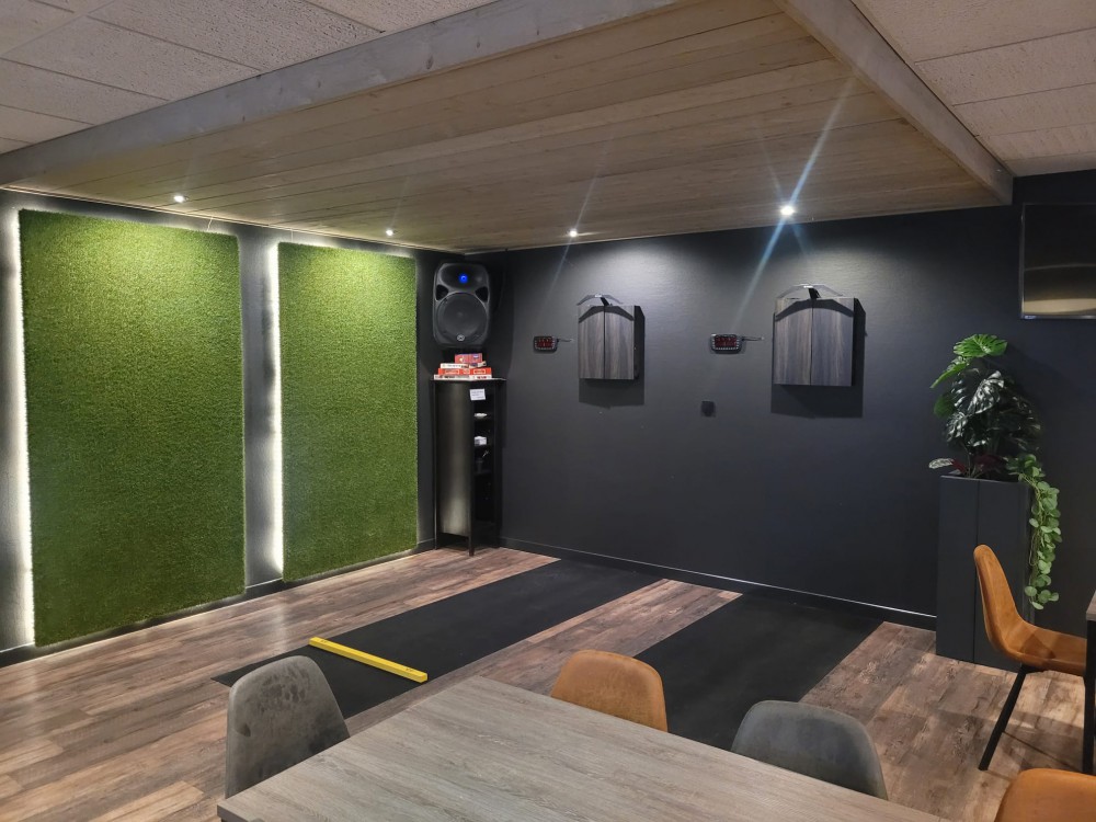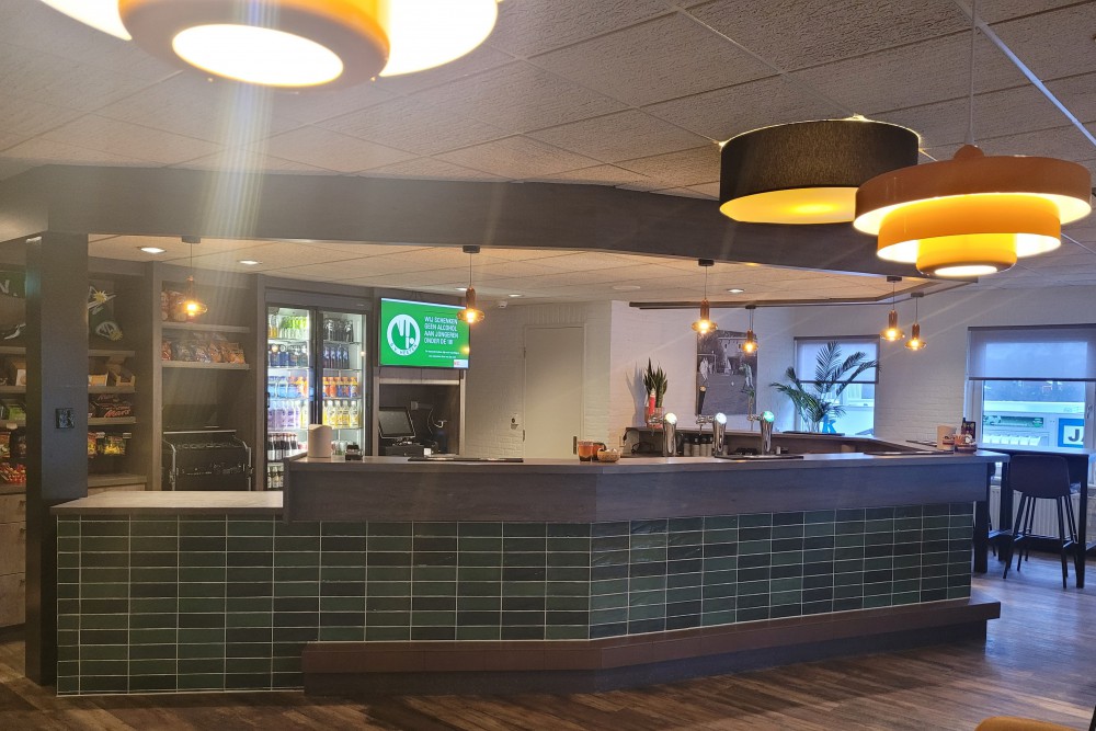 Er is ontzettend veel werk verzet: de bar is opnieuw betegeld, er zijn kunstgraswanden geplaatst bij de dartbanen en in de bestuurskamer, boven in de bestuurskamer is de bar opnieuw bekleed, er zijn nieuwe lampen opgehangen en ons logo staat nu gebrand op enkele tafels. Daarnaast is het geheel aangekleed met planten en accessoires. Eerder dit jaar zijn bovendien al nieuwe tafels en stoelen geleverd, wat het geheel helemaal afmaakt.